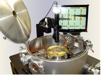 Obr.:Meracie hroty v antivibračnej vákuovej komore na meranie parametrov mikrosenzorov až do teploty 300 °C
